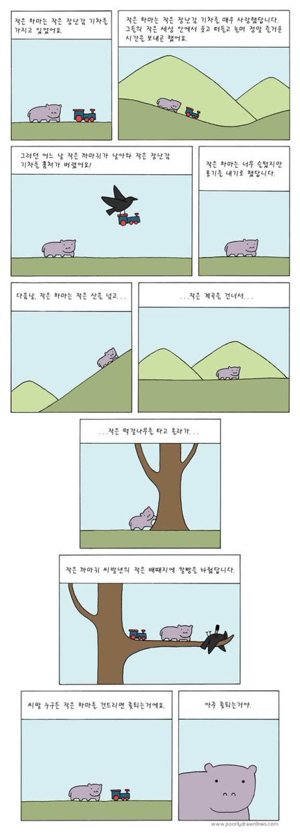 작은 하마가 작은 장난감 기차와 함께 즐거운 시간을 보내던 와중, 작은 까마귀가 작은 장난감 기차를 훔쳐가자 작은 산, 작은 계곡, 작은 떡갈나무를 거쳐 작은 까마귀에게 칼빵을 놓고 작은 장난감 기차를 되찾았다는 내용이다. 마지막에 작은 하마의 얼굴을 클로즈업하며 작은 하마의 무서움을 강조하는 것이 포인트.