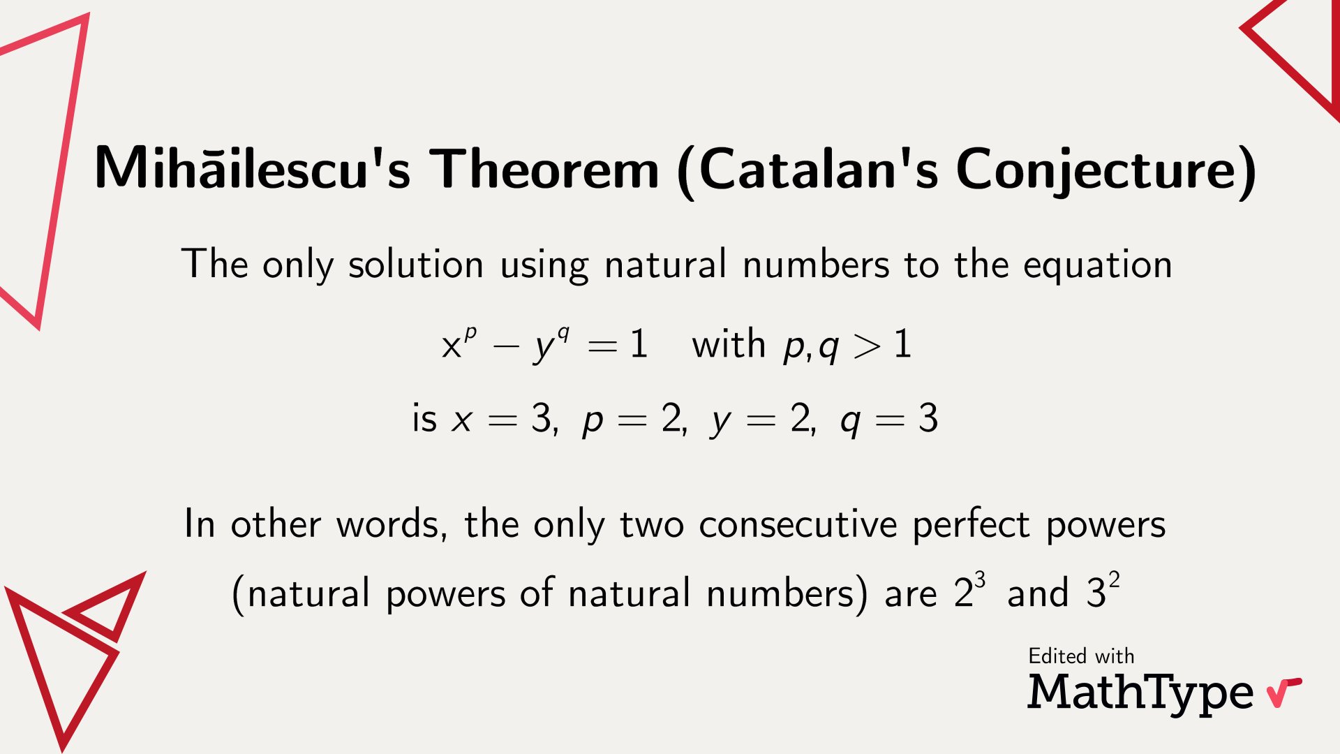 3^2(=9) 밖에 없다는 수론의 정리이다. 1844년 프랑스의 수학자 외젠 샤를 카탈랑(Eugène Charles Catalan)에 의해 추측되고 158년 뒤인 2002년 루마니아 수학자 프레다 미허일레스쿠(Preda Mihăilescu)에 의해 증명되었다. 그래서 미허일레스쿠의 정리(Mihăilescu's theorem)라고도 한다.